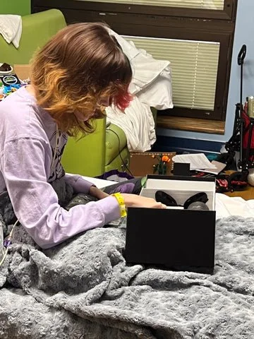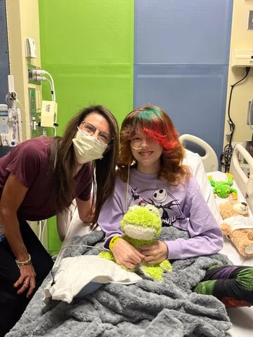 Our final fitting of the day took place in the hospital room of Claire, an inpatient at Shands. Claire had requested a unique wig with a “wolf cut” style, complete with bold red and blue stripes. The joy in her eyes when she saw her custom wig was palpable. Her vibrant personality shone through as she chatted eagerly during the fitting, delighted by how perfectly the wigmaker had captured her vision. As Claire and her mother admired the final look, we shared wig care products and took a few photos, savoring the heartwarming connection that forms when confidence and joy are restored.